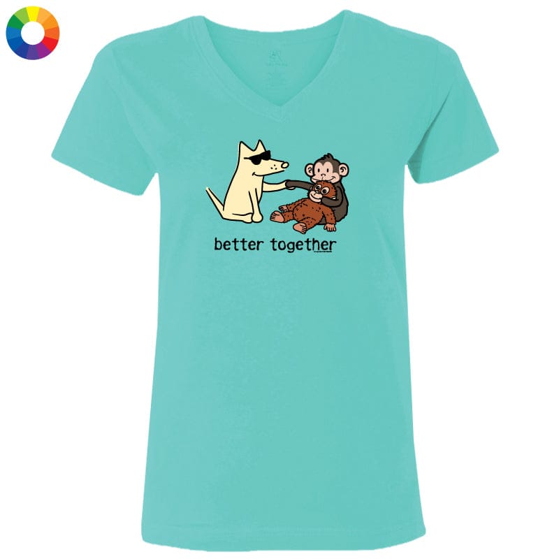 This Chill Blue or Natural ladies' v-neck tee offers softness and style. Crafted from 100% combed, ringspun cotton. Like all our puppy-soft apparel, it’s proudly decorated in the USA. Easy to care for—just machine wash and dry.