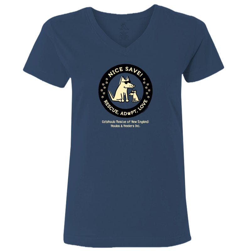 This Navy ladies' v-neck tee offers softness and style. Crafted from 100% combed, ringspun cotton. Like all our puppy-soft apparel, it’s proudly decorated in the USA and is machine wash and dry for easy care.