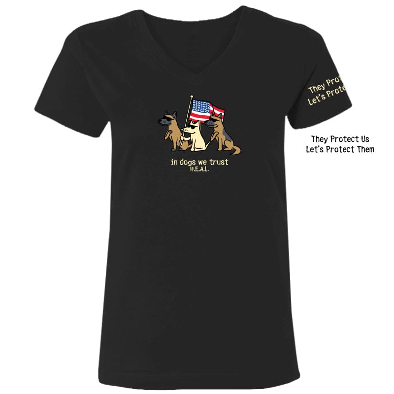 This Black ladies' v-neck tee offers softness and style. Crafted from 100% combed, ringspun cotton. Like all our puppy-soft apparel, it’s proudly decorated in the USA and is machine wash and dry for easy care.