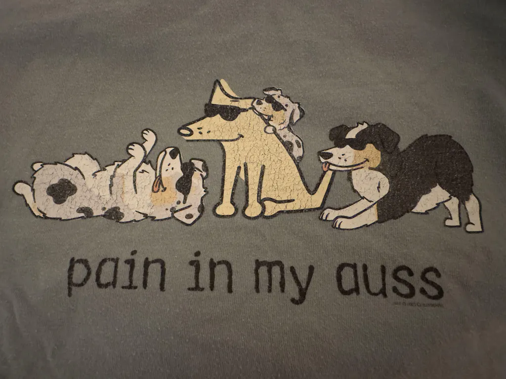 I love the cute Pain in my Auss design. The shirt fits as expected based on sizing, and the quality of the shirt itself is good as it does not feel thin or cheap. I am disappointed in the wear of the design. After just a few washes (cool water, low dry) the design has cracked significantly. So think of it more of a shirt you will use for a season rather than one where you will get many years of use.