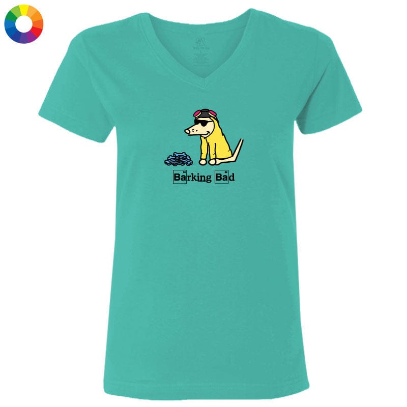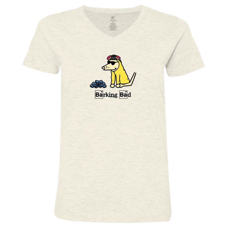 This ladies' v-neck tee, available in Natural Heather or Caribbean, offers softness and style. The Caribbean option is crafted from 100% combed, ringspun cotton, while the natural heather is made from a cozy cotton-poly blend. Like all our puppy-soft apparel, it’s proudly decorated in the USA and is machine wash and dry for easy care.
