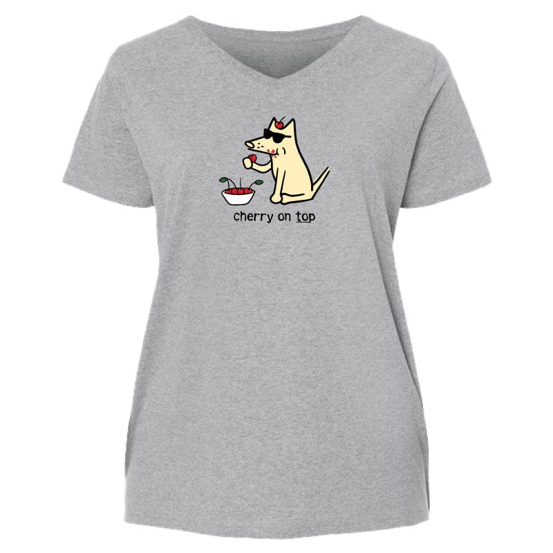 This heather grey, curvy, ladies v-neck tee is puppy soft and decorated right here in the U.S.A. Machine wash and dry.