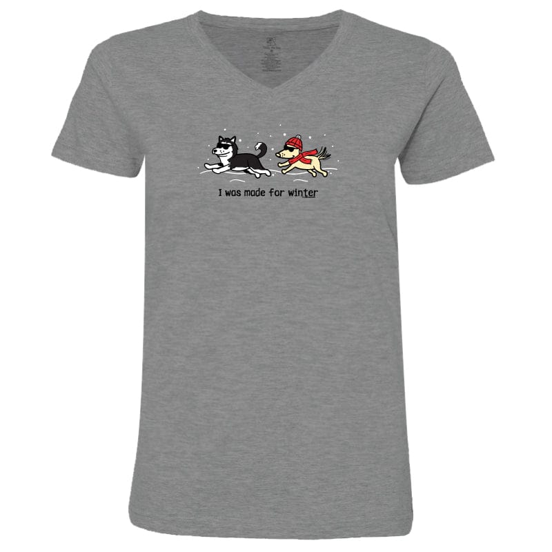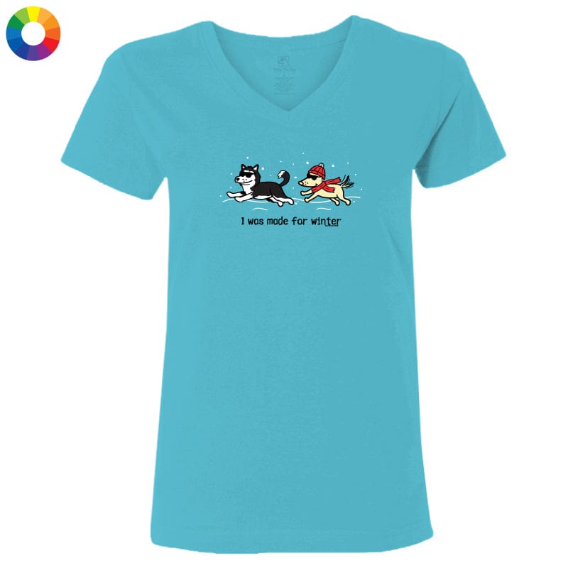 This ladies' v-neck tee, available in granite or aqua, offers softness and style. The aqua option is crafted from 100% combed, ringspun cotton, while the granite is made from a cozy cotton-poly blend. Like all our puppy-soft apparel, it’s proudly decorated in the USA and is machine washable and dryable for easy care.