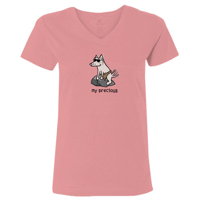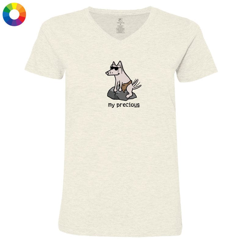 This ladies' v-neck tee, available in natural heather or mauvelous, offers softness and style. The Mauvelous option is crafted from 100% combed, ringspun cotton, while the natural heather is made from a cozy cotton-poly blend. Like all our puppy-soft apparel, it’s proudly decorated in the USA and is machine wash and dry for easy care.