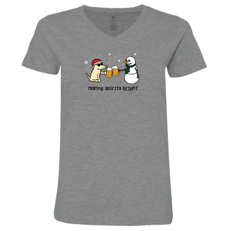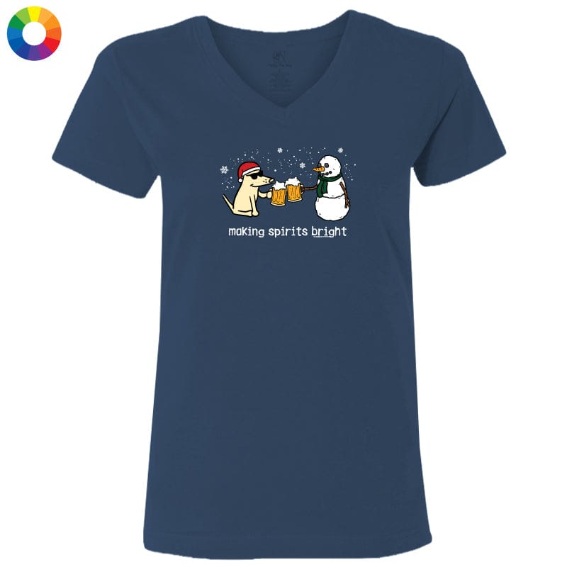 This ladies' v-neck tee, available in granite or navy, offers softness and style. The navy option is crafted from 100% combed, ringspun cotton, while the granite is made from a cozy cotton-poly blend. Like all our puppy-soft apparel, it’s proudly decorated in the USA and is machine wash and dry for easy care.