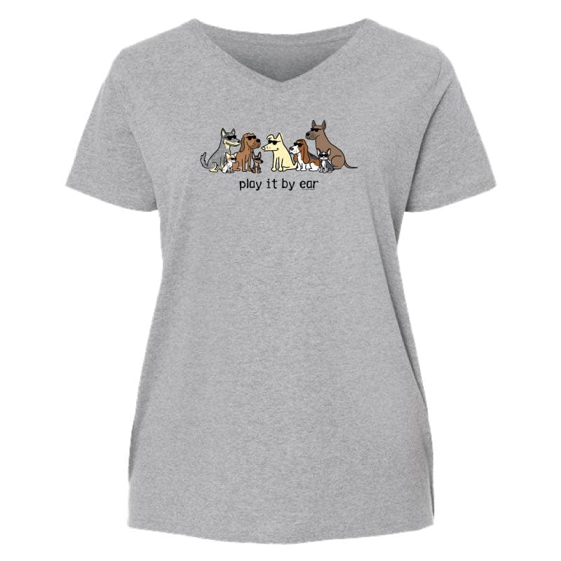 This heather grey, curvy, ladies v-neck tee is puppy soft and decorated right here in the U.S.A. Machine wash and dry.