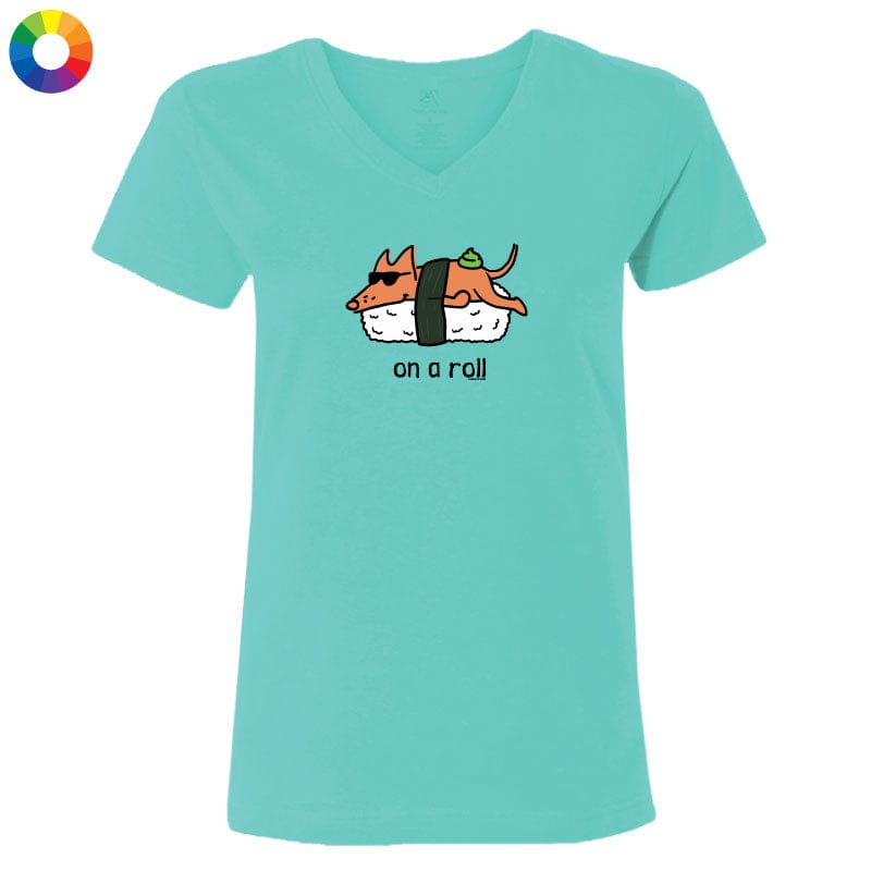 This chill blue or light pink ladies, v-neck tee, is made of 100% combed, ringspun cotton. All my puppy soft apparel is decorated right here in the U.S.A. Machine wash and dry.