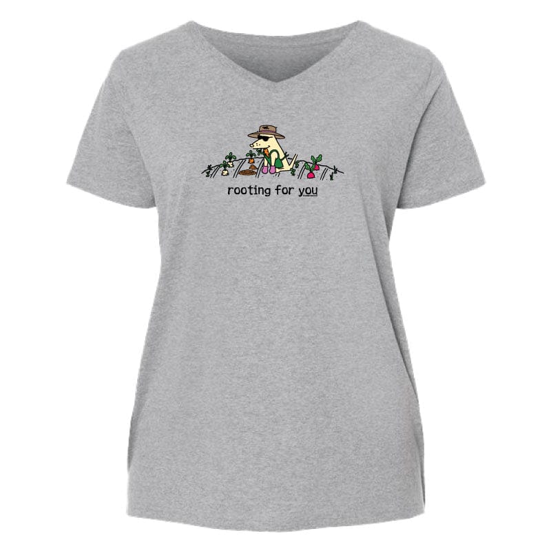 This heather grey, curvy, ladies v-neck tee is puppy soft and decorated right here in the U.S.A. Machine wash and dry.