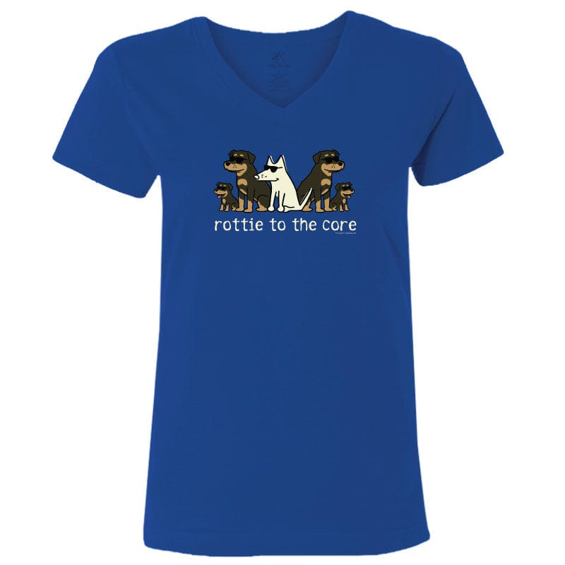 I love being spoiled rottie. You can spoil yourself rottie too with my royal, ladies v-neck tee. It is puppy soft and decorated right here in the U.S.A. Machine wash and dry.