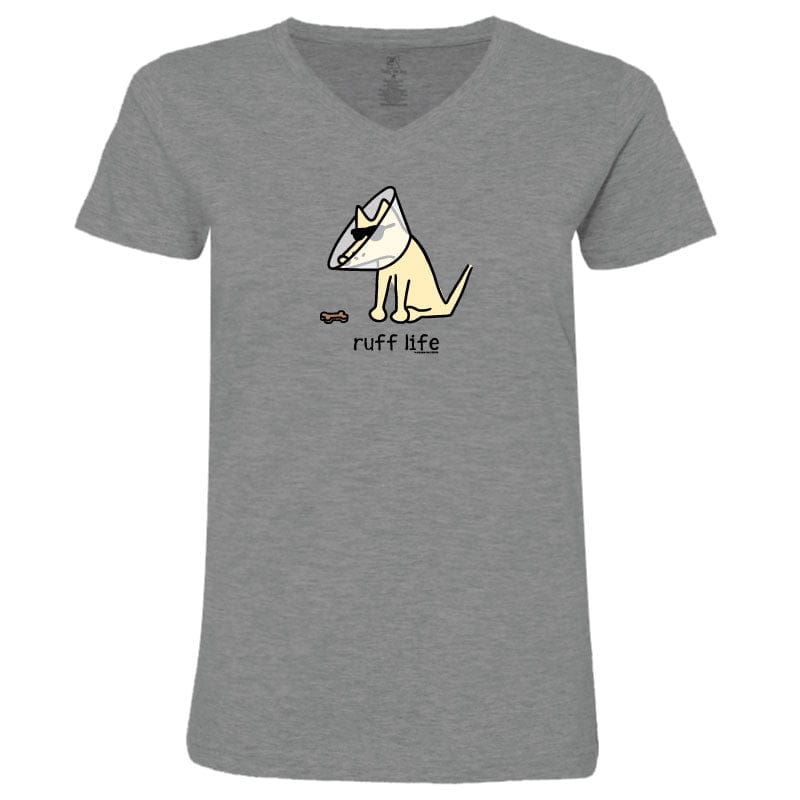 This ladies' v-neck tee, available in granite or chill blue, offers softness and style. The chill blue option is crafted from 100% combed, ringspun cotton, while the granite is made from a cozy cotton-poly blend. Like all our puppy-soft apparel, it’s proudly decorated in the USA. Easy to care for—just machine wash and dry.