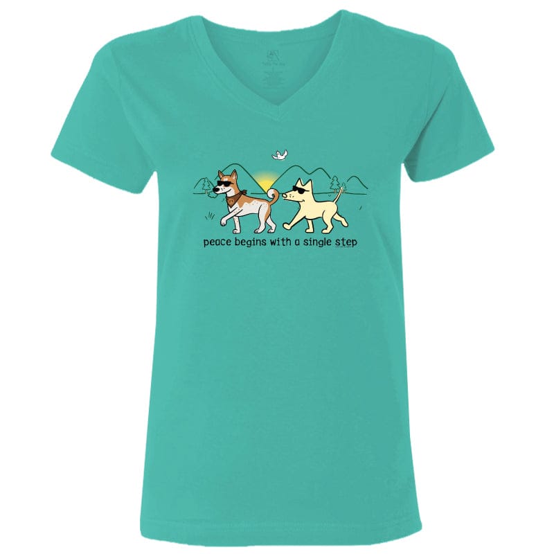 This ladies' v-neck tee, available in natural heather or caribbean, offers softness and style. The caribbean option is crafted from 100% combed, ringspun cotton, while the natural heather is made from a cozy cotton-poly blend. Like all our puppy-soft apparel, it’s proudly decorated in the USA and is machine washable and dryable for easy care.