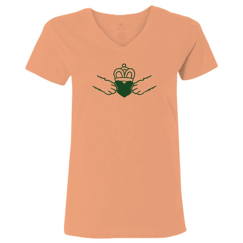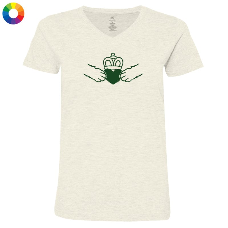 This ladies' v-neck tee, available in natural heather or mango, offers softness and style. The mango option is crafted from 100% combed, ringspun cotton, while the natural heather is made from a cozy cotton-poly blend. Like all our puppy-soft apparel, it’s proudly decorated in the USA and is machine wash and dry for easy care.