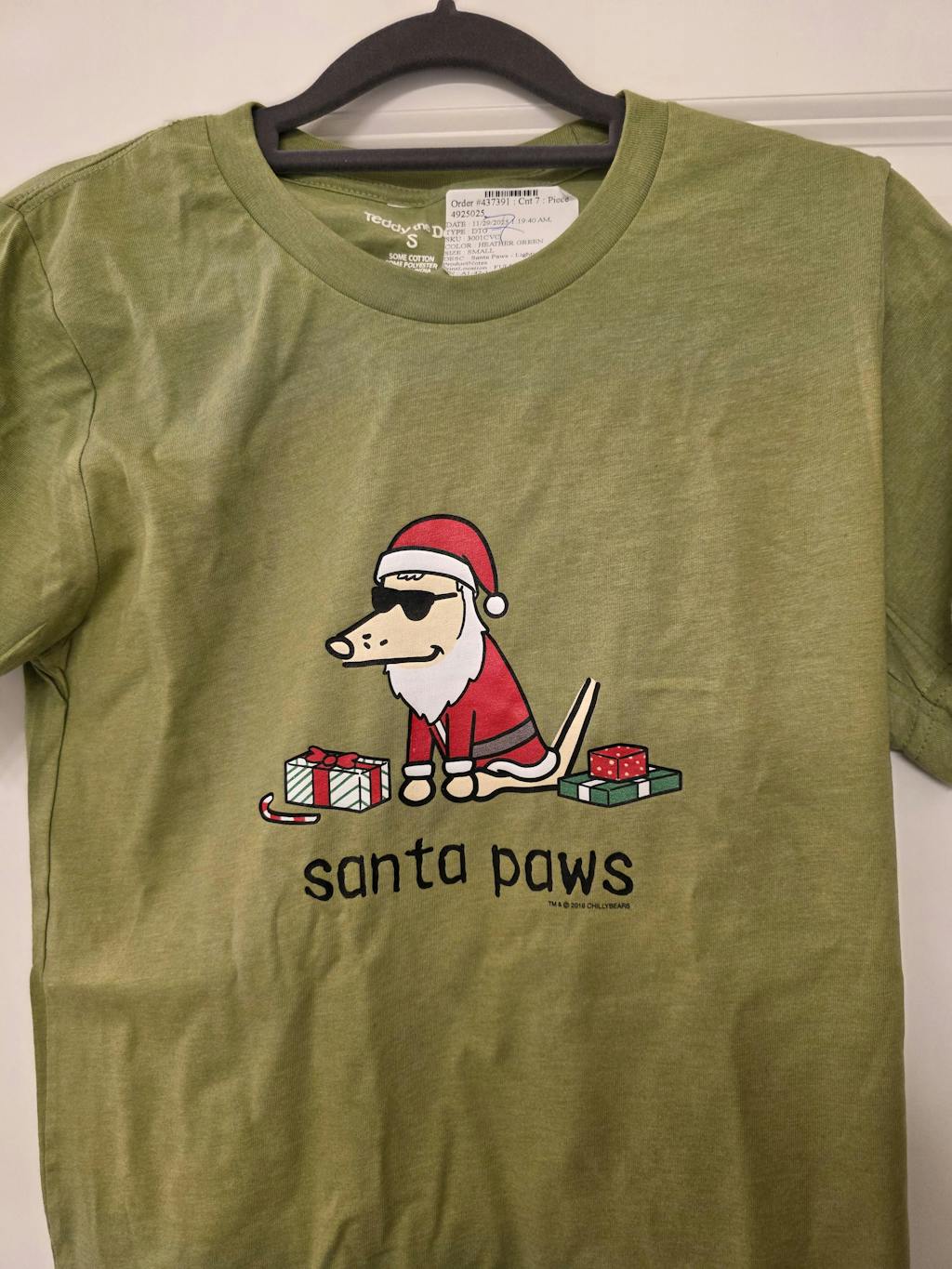 This heather green lightweight tee, is puppy soft and decorated right here in the U.S.A. Machine wash and dry. Orders close 11/25, starts shipping 12/2.