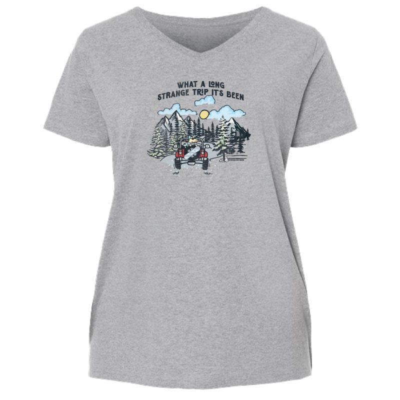 This heather grey, curvy, ladies v-neck tee is puppy soft and decorated right here in the U.S.A. Machine wash and dry.