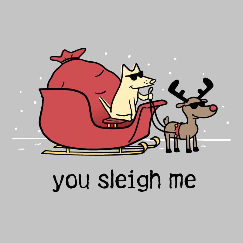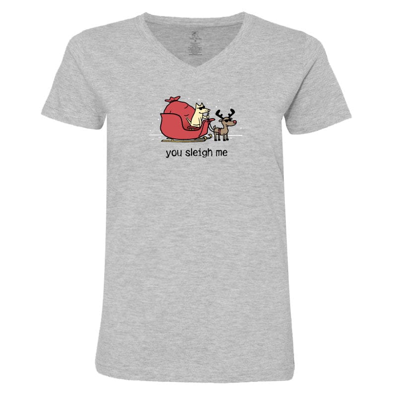 You sleigh me... you really do... especially in this ladies V-neck tee . Made of a cotton/polly blend, all all my puppy soft apparel is decorated right here in the U.S.A. Machine wash and dry.