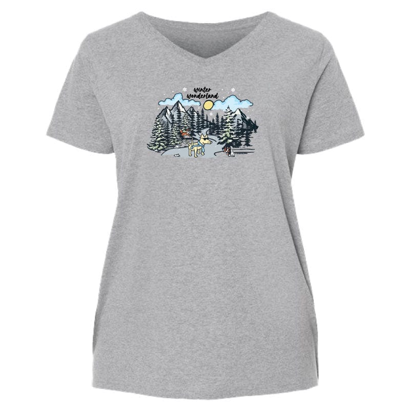 This heather grey, curvy, ladies v-neck tee is puppy soft and decorated right here in the U.S.A. Machine wash and dry.