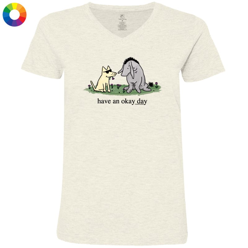 This ladies' v-neck tee, available in natural heather or navy, offers softness and style. The navy option is crafted from 100% combed, ringspun cotton, while the natural heather is made from a cozy cotton-poly blend. Like all our puppy-soft apparel, it’s proudly decorated in the USA and is machine washable and dryable for easy care.